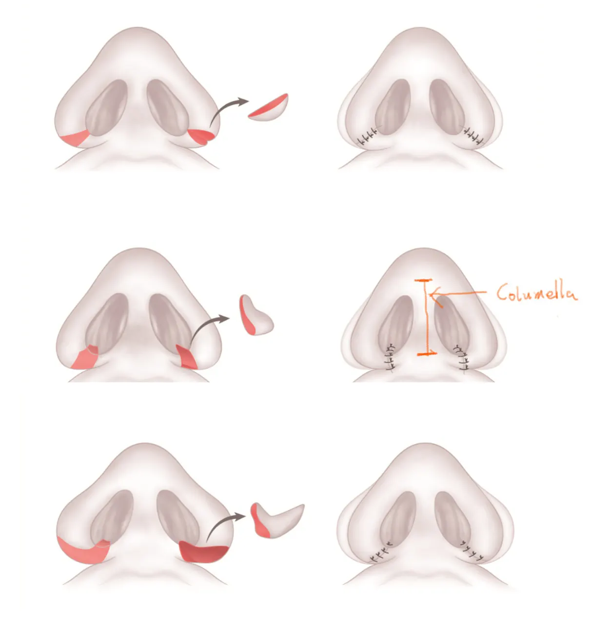 - تکنیک وج (Wedge Excision): در این روش، یک برش مثلثی شکل در قسمت خارجی پره برداشته میشود تا عرض پایه کاهش یابد. مناسب برای کاهش فلیرینگ بدون تغییر اندازه سوراخهای بینی. من این تکنیک را برای بیماران با پرههای ضخیم استفاده میکنم چون جای زخم در چین طبیعی بینی پنهان میشود.