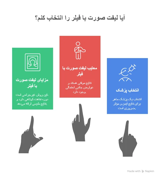 در افتادگیهای خفیف تا متوسط، فیلر گزینه بهتری است. اما برای افتادگیهای شدید، ترکیب فیلر و نخ میتواند بهترین نتیجه را بدهد.