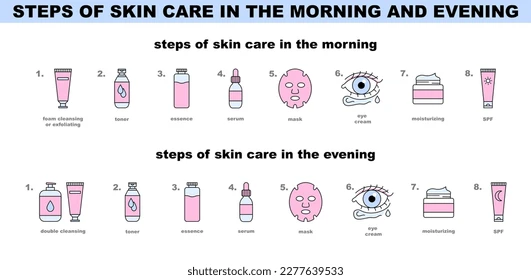 مثال روتین صبح: پاکسازی با ژل، تونر، سرم ویتامین C، مرطوبکننده، ضدآفتاب. شب: پاکسازی دو مرحلهای، تونر، سرم رتینول، مرطوبکننده.