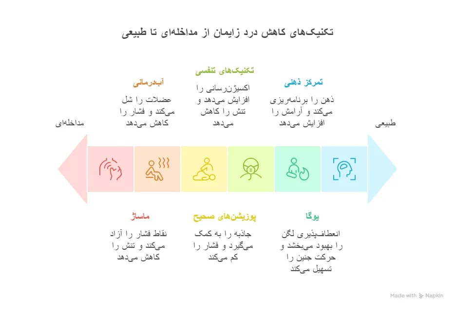 نقش پشتیبانی همسر (ماساژ، تشویق) و تیم زایمان (ماما آگاه) غیرقابل انکار است. مطالعات نشان میدهد حمایت عاطفی درد ادراکشده را تا ۳۵ درصد کم میکند.