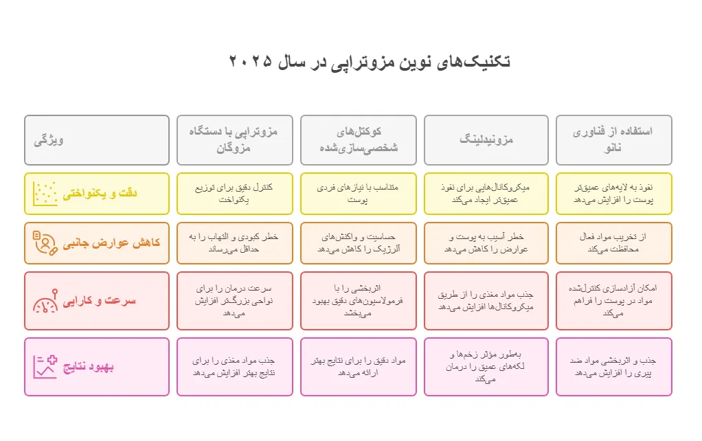با پیشرفت فناوری، تکنیکهای مزوتراپی در سال ۲۰۲۵ به سطح جدیدی از دقت و کارایی رسیدهاند. برخی از تکنیکهای نوین عبارتاند از: